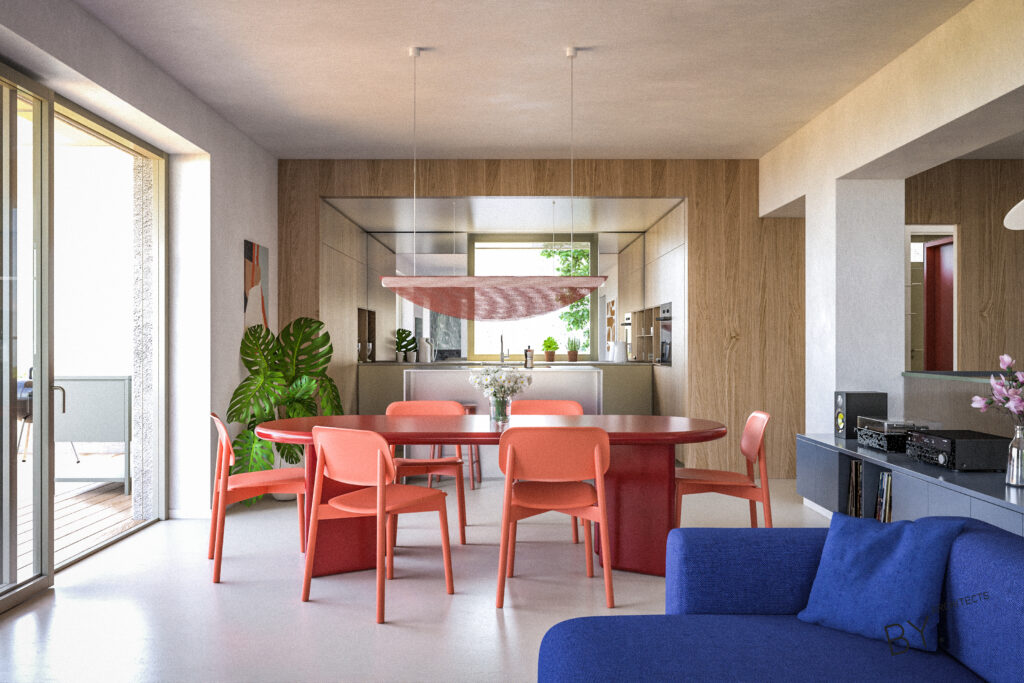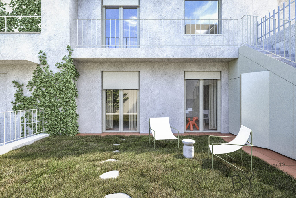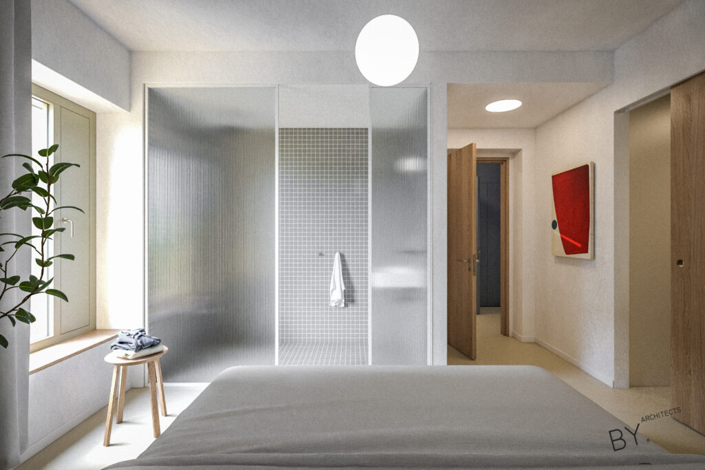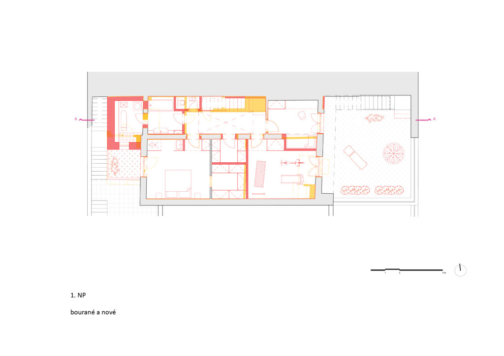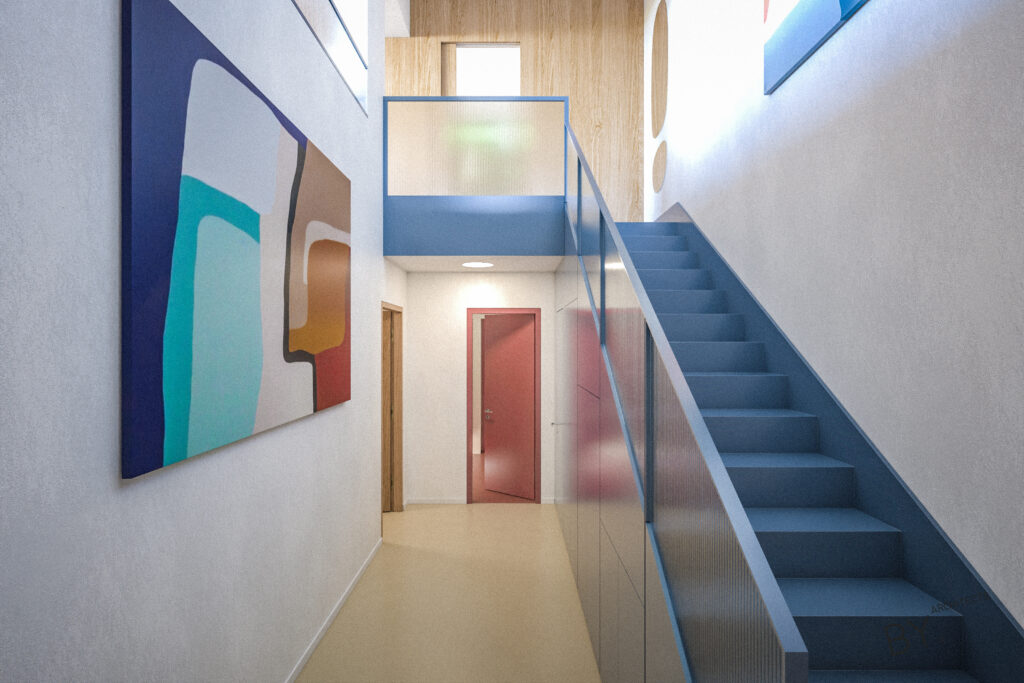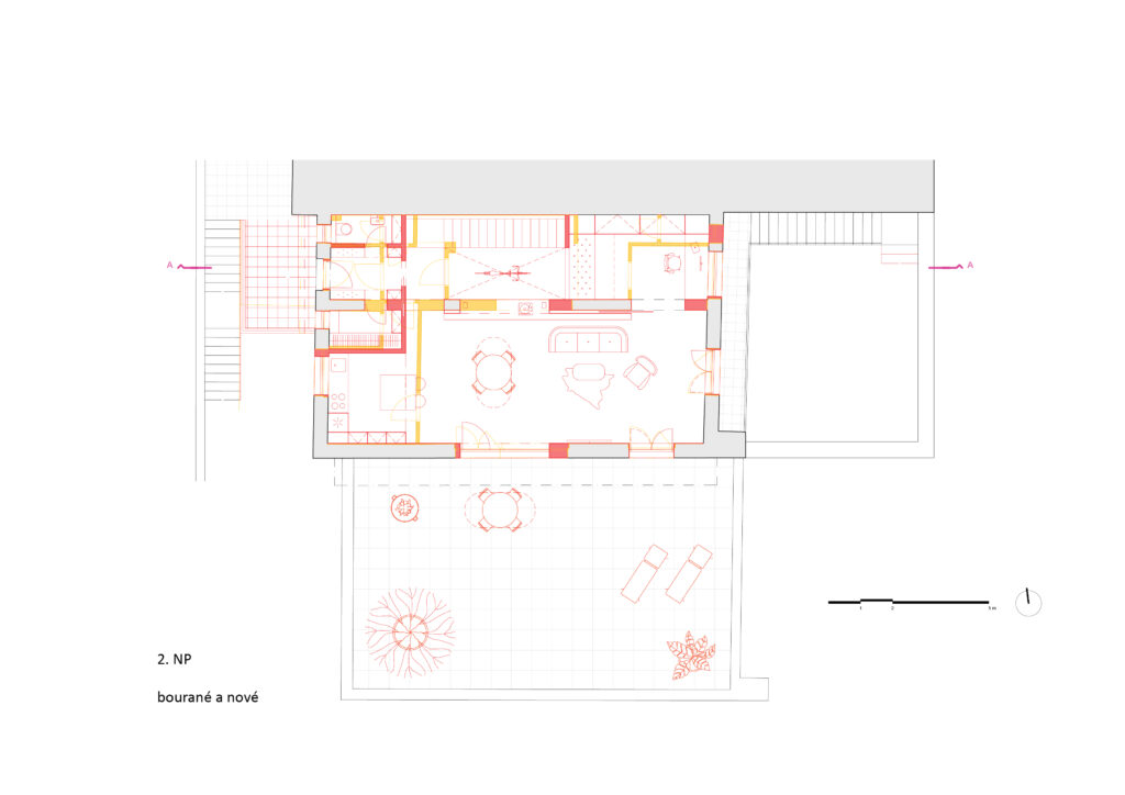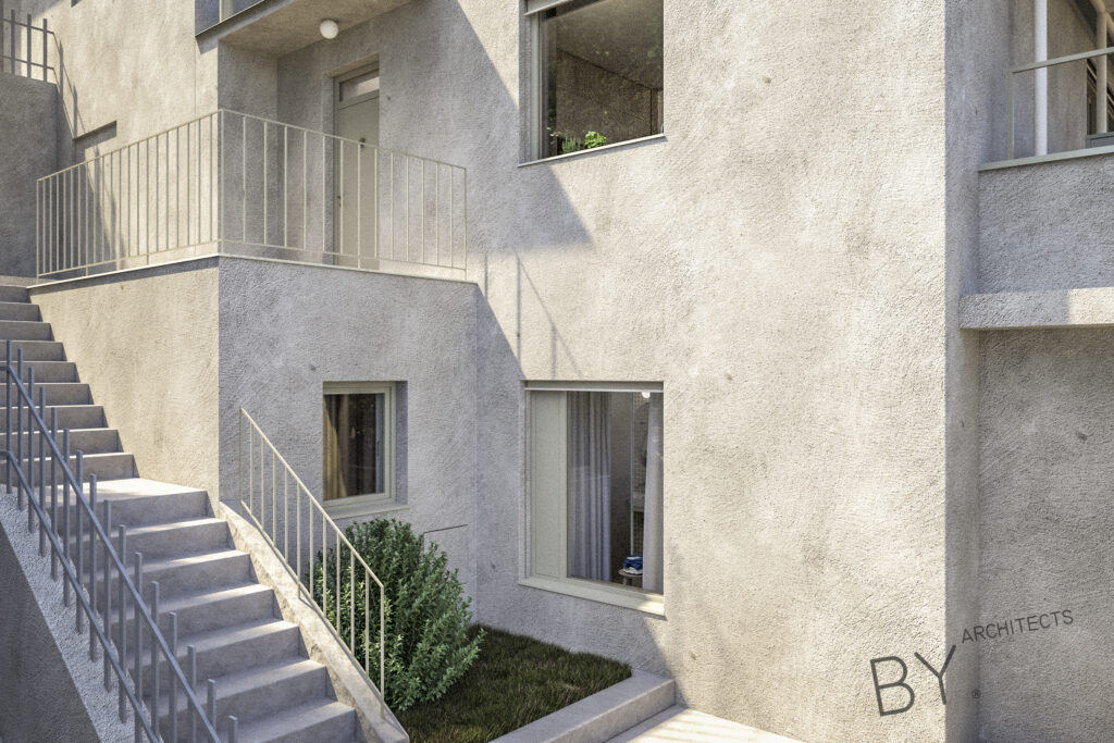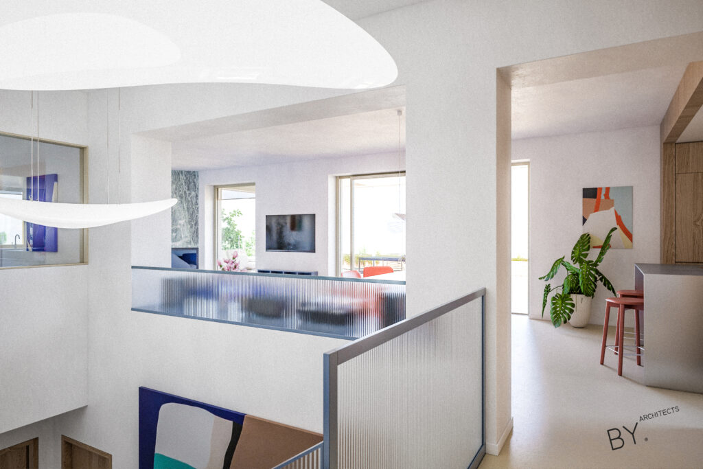 Přerovnání jednoho z domů na pražských Hřebenkách. Měli jsme možnost prostudovat specifickou typologii terasových domů, kde je spodní podlaží s ložnicemi chabě osvětleno. My jsem se s tímto problémem vypořádali průrazem mezi podlažími, díky kterému získává dům velkorysost odpovídající jeho objemu i lokalitě.