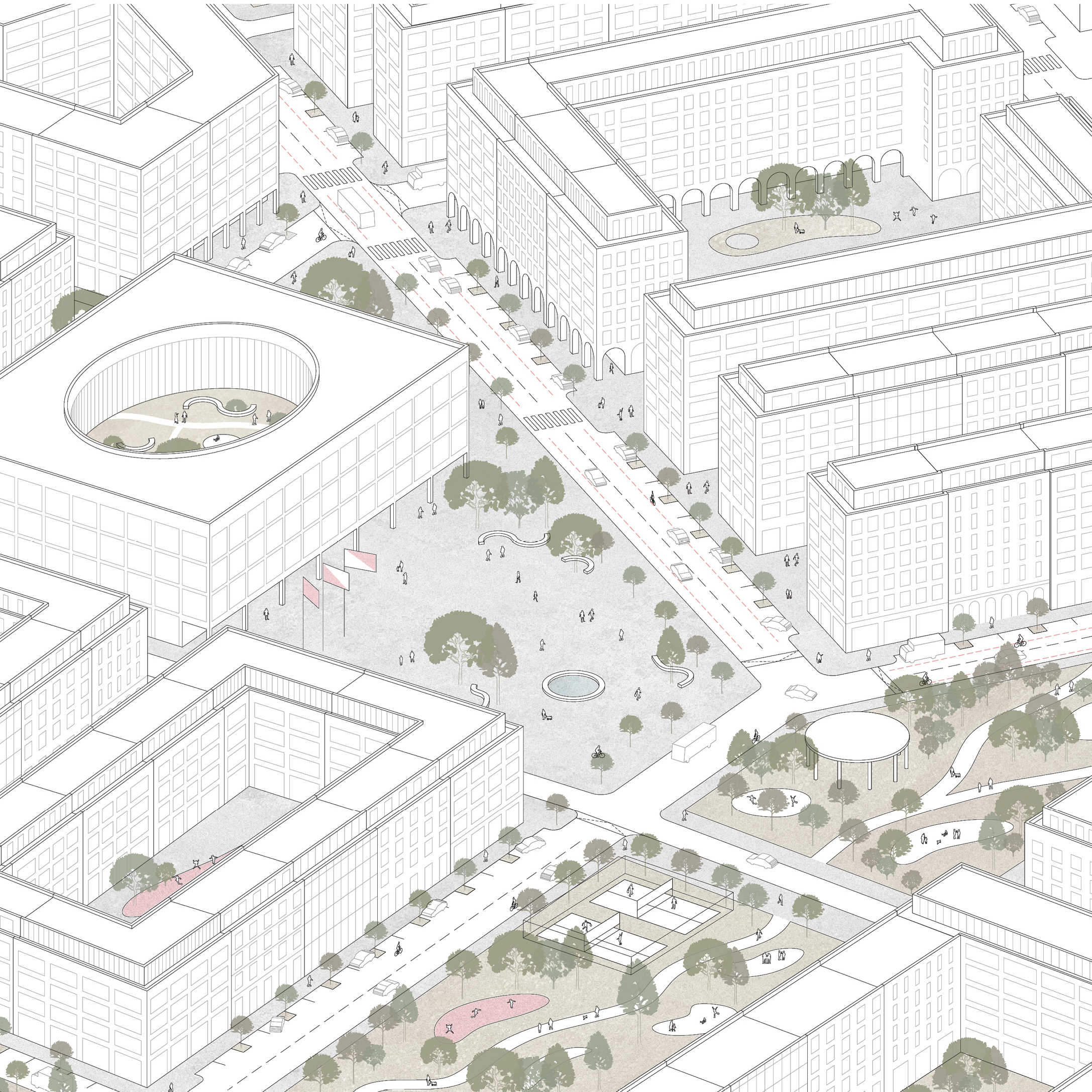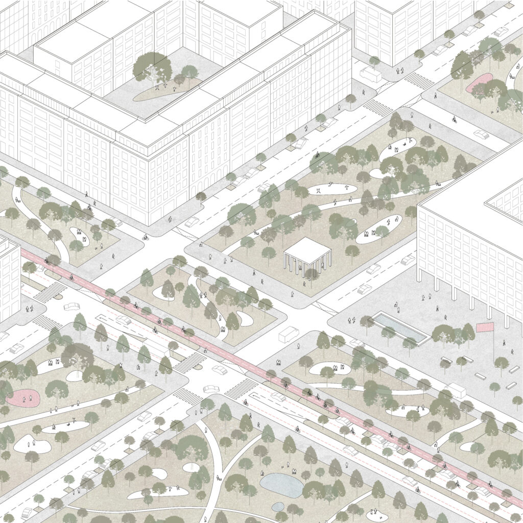 Centrální park leží z velké části na pozemcích města (státu), čímž minimalizujeme potřebu odkupu pozemků. Nabízíme členění struktury na lokální centra s piazzetami, navrhujeme zelené koridory / lineární parky s pobytovými funkcemi, vše pro co nejpříjemnější pobyt, oddech či práci v zeleni.