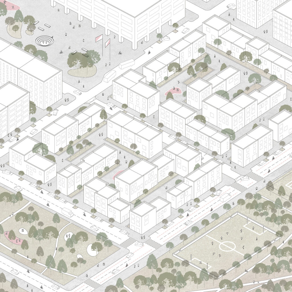 Návrh nabízí maximální míru realizovatelnosti výstavby nové čtvrti na území vlastněné mnoha subjekty. Základní klíč k řešení je stávající bezejmenná komunikace vedoucí na rozhraní pozemkových parcel, která po vytvoření základní infrastruktury, funguje jako tepna nové výstavby. V důsledku to znamená obrovskou flexibilitu, kdy naprostá většina subjektů může jednoduše začít s výstavbou, v případě dohody dvou subjektů pak mají možnost vznikat i velké celky. Tento snadný start považujeme za vhodný iniciační moment a motivaci pro další majitele.