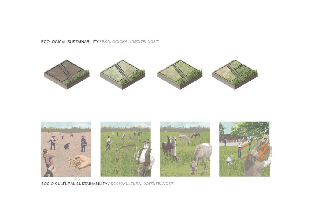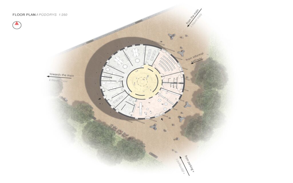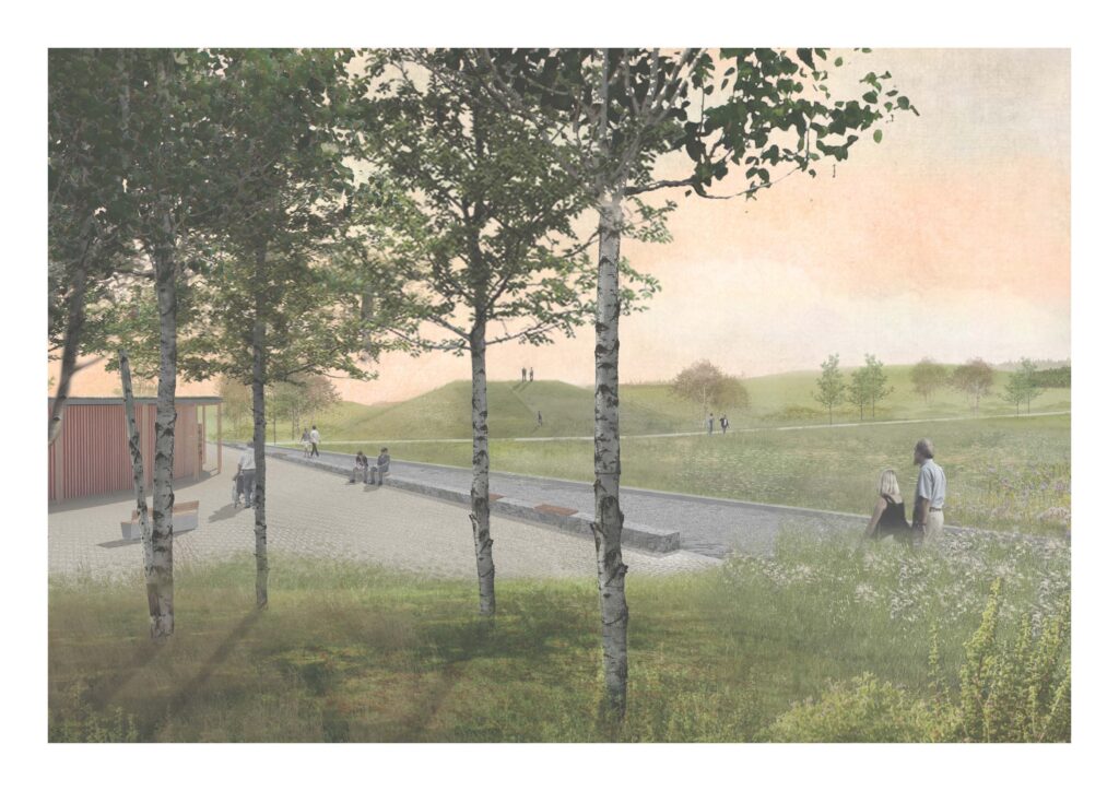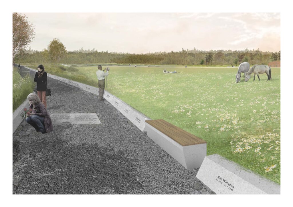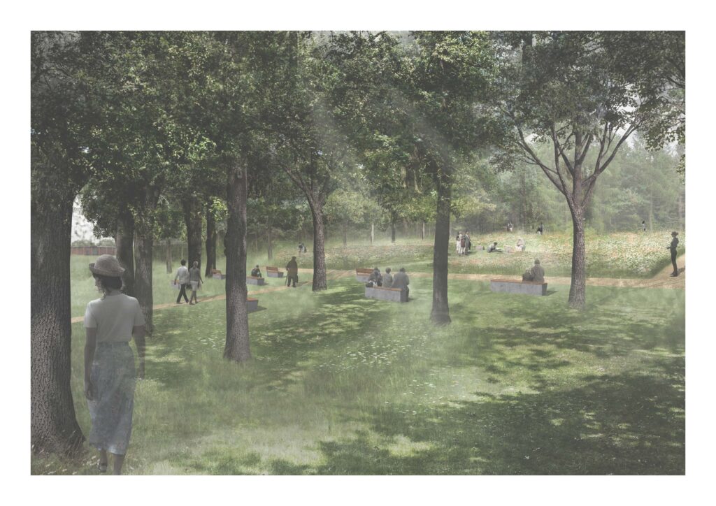 táborem, stávajícím hřbitovem a novým kulturně-vzdělávacím centrem a vede